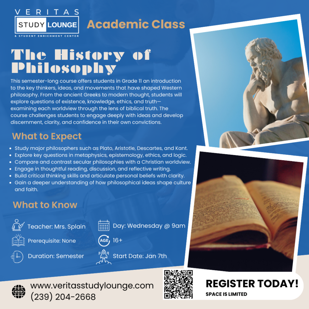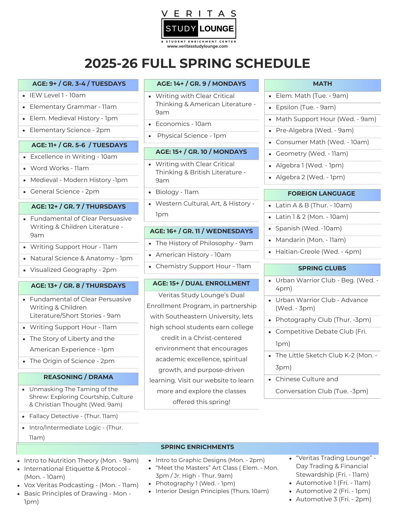We are excited to announce our 2025-26 course offerings! Stay tuned for updates, and don’t hesitate to reach out with any questions. We look forward to another wonderful year of learning at Veritas Study Lounge!