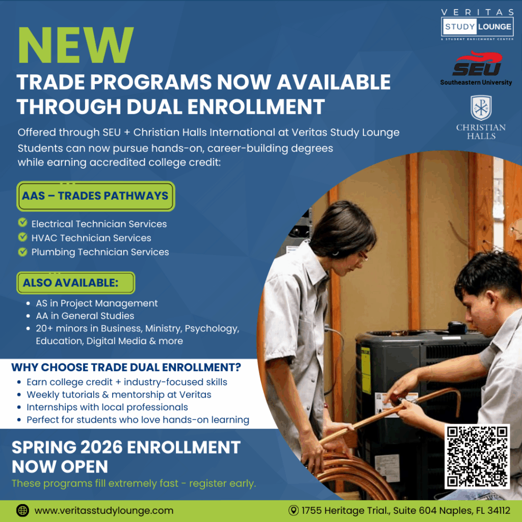 Looking for a safe, faith-filled space where your teen can earn college credit while still in high school?  Veritas Study Lounge’s Dual Enrollment Program, in partnership with Christian Halls Internationals and Southeastern University, will be offering affordable, Christ-centered college courses with on-site support and mentorship.