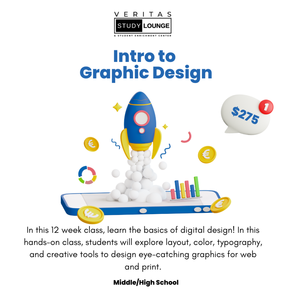 In this 12 week class, learn the basics of digital design! In this hands-on class, students will explore layout, color, typography, and creative tools to design eye-catching graphics for web and print.